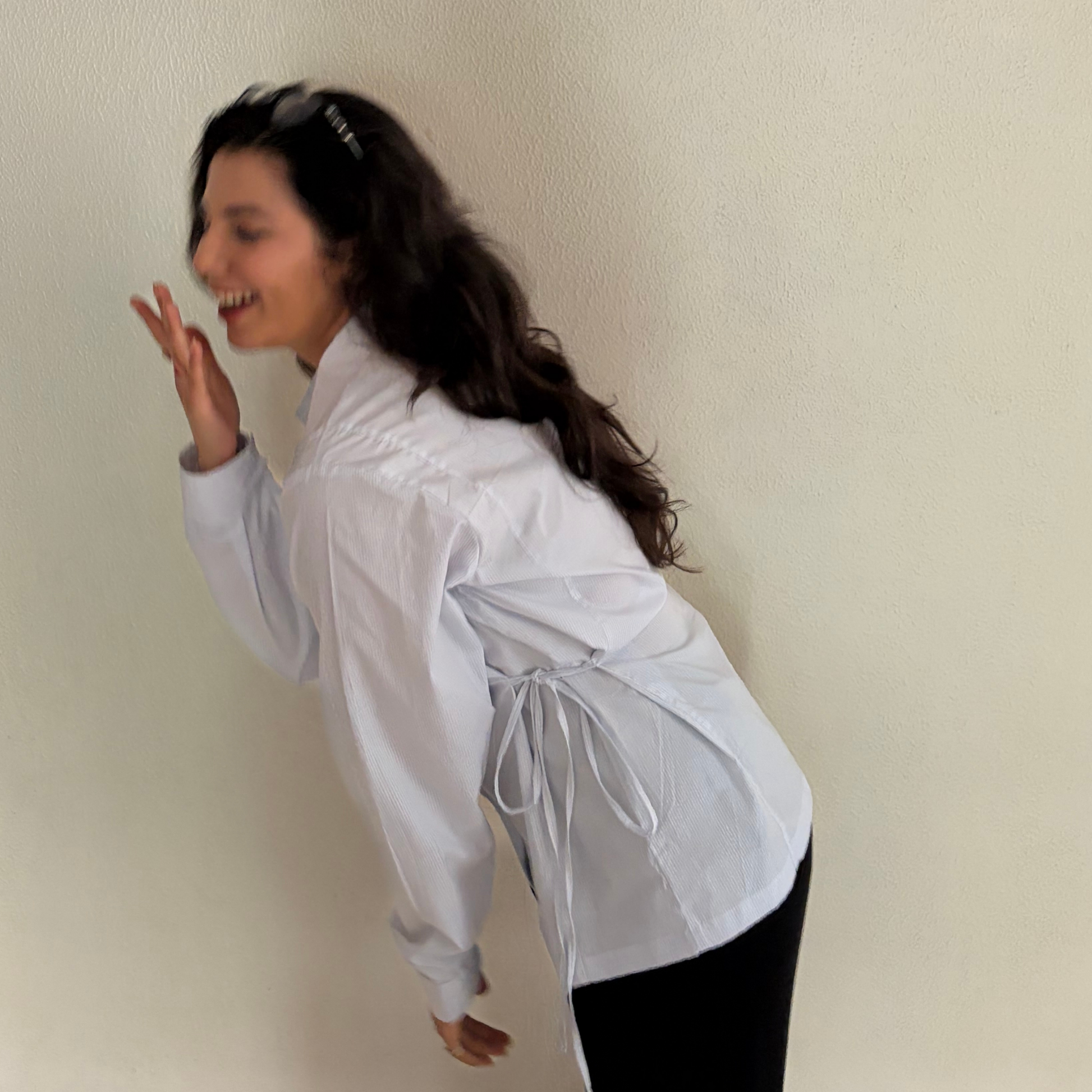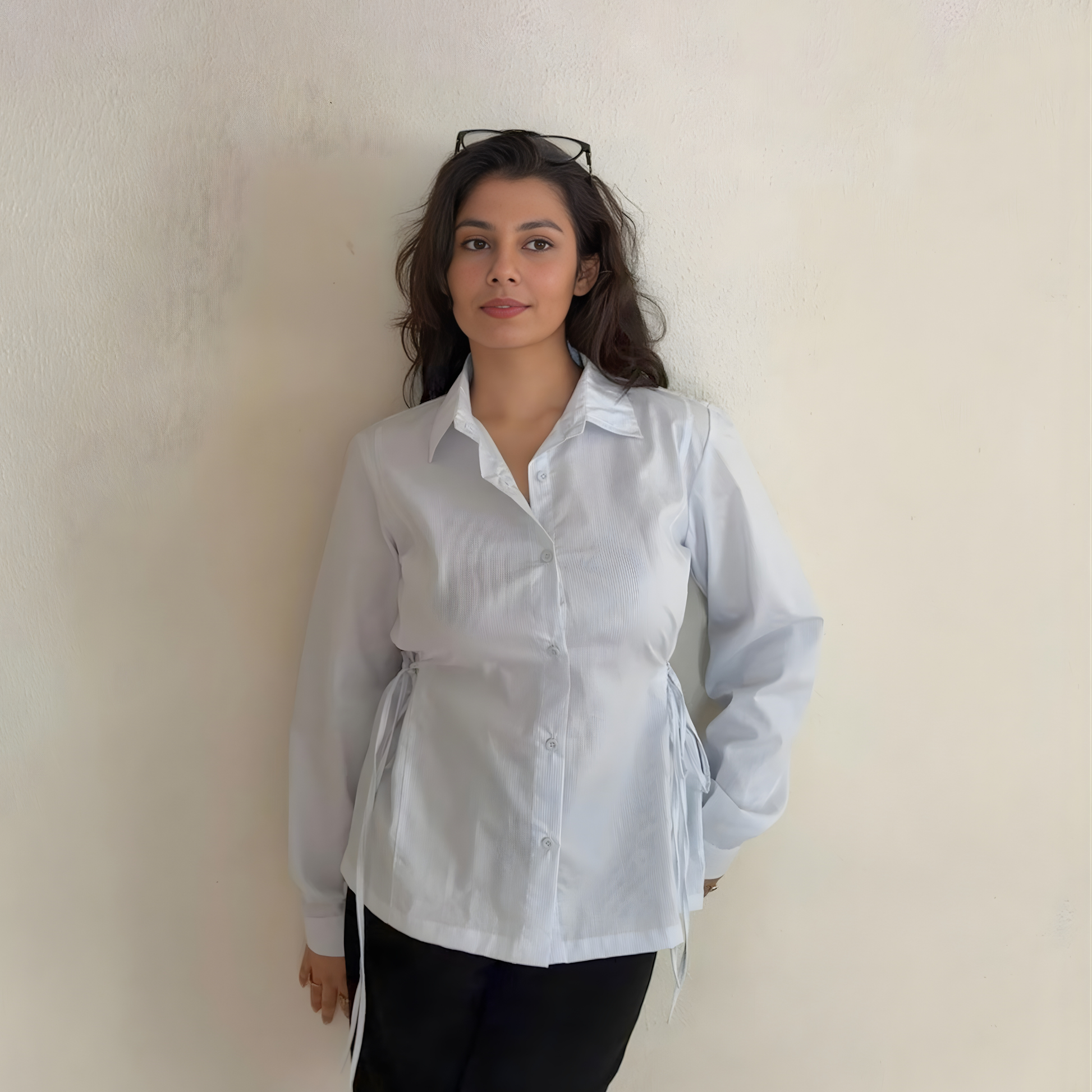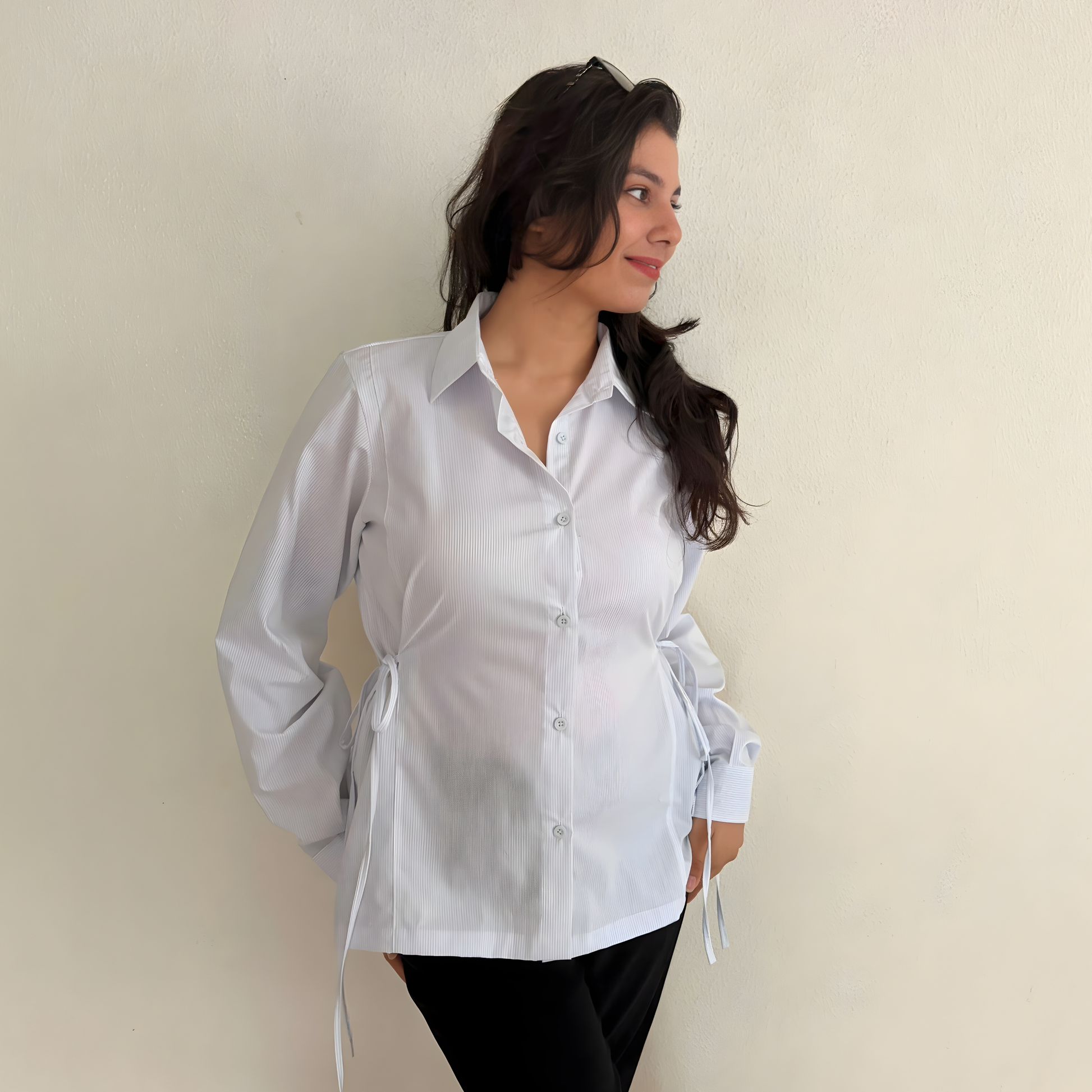 A blue and white striped poplin shirt designed to elevate everyday dressing. Crafted in a relaxed yet polished silhouette, it features side tie detailing that cinches the waist for a subtle, flattering structure while keeping the look effortless. Easy to style and comfortable for all-day wear, this shirt works perfectly for office days, casual outings, or laid-back styling with a refined touch.