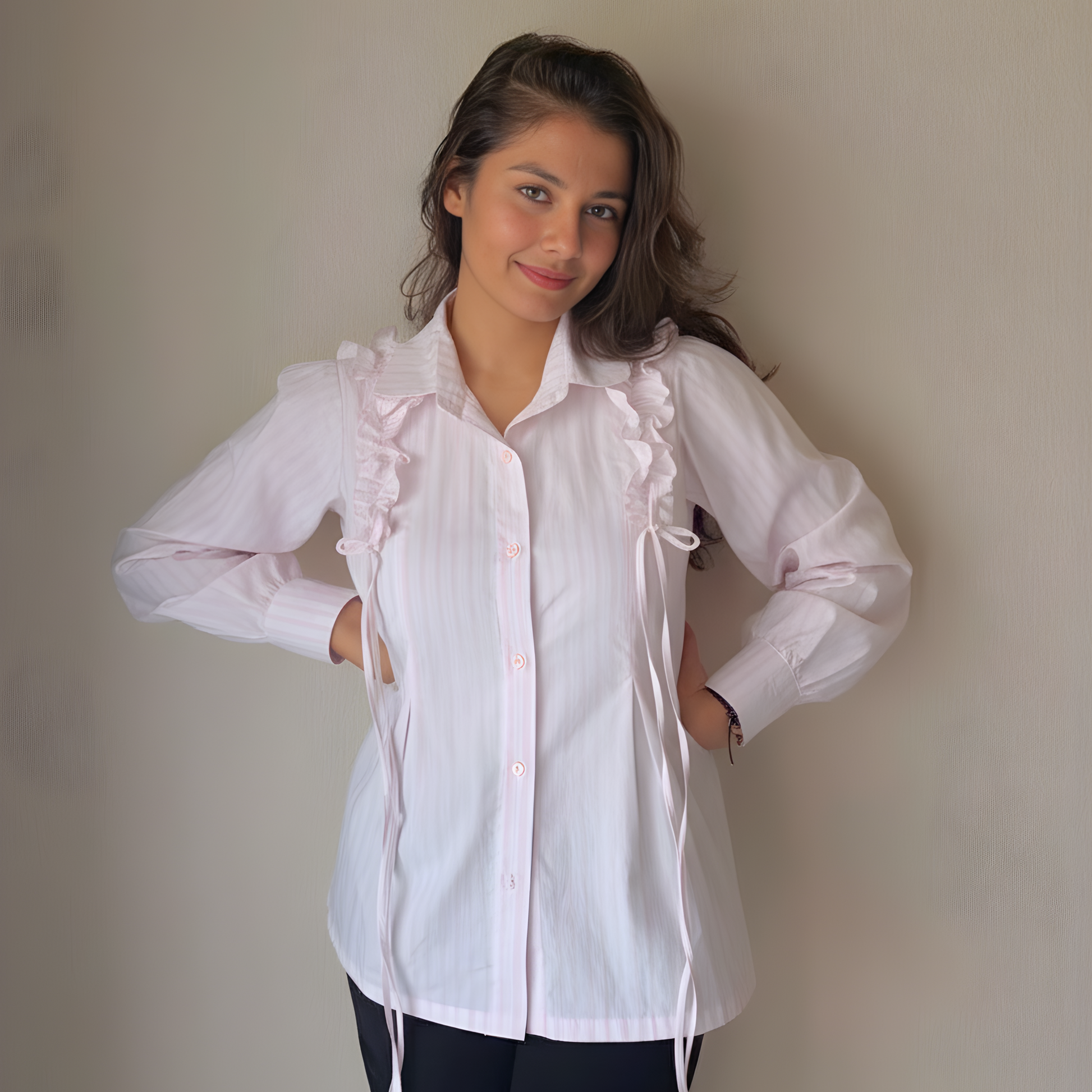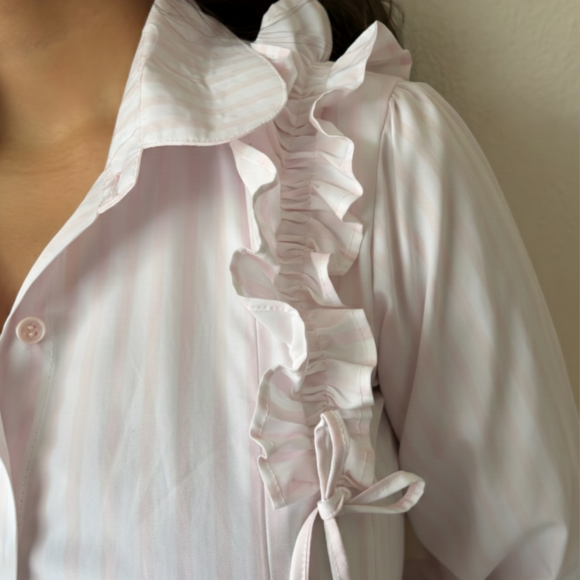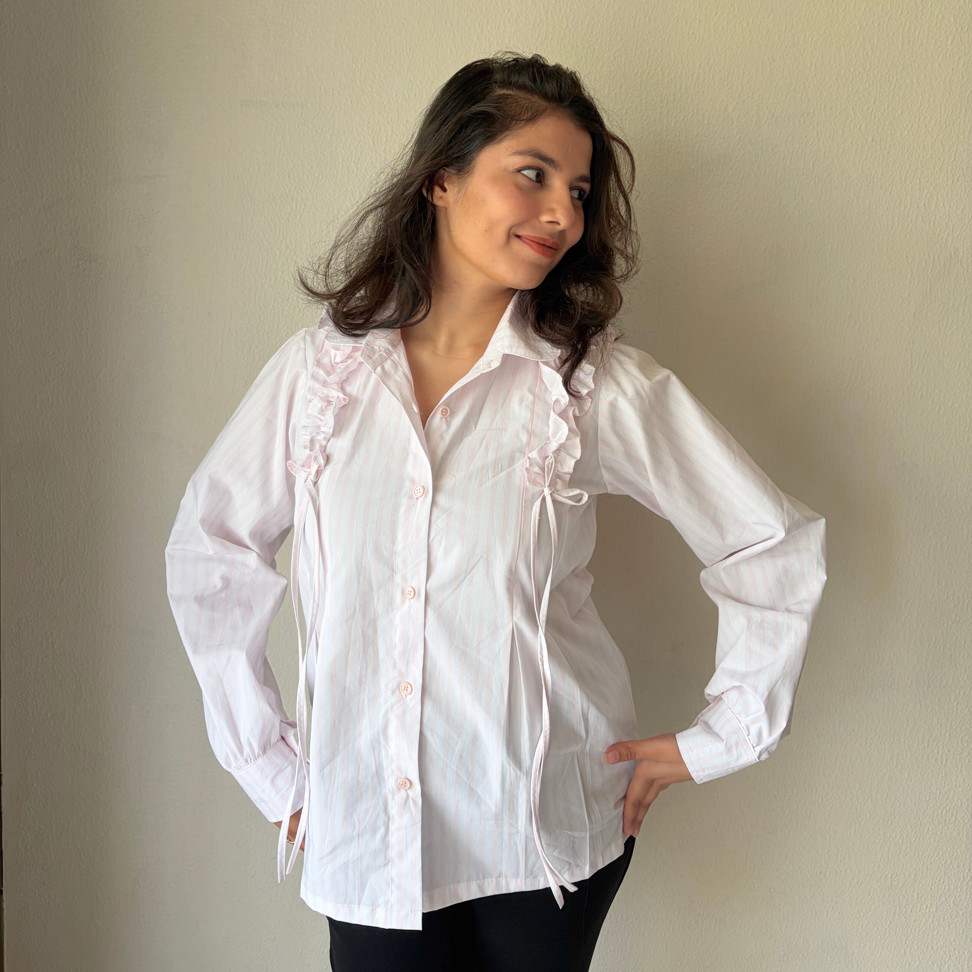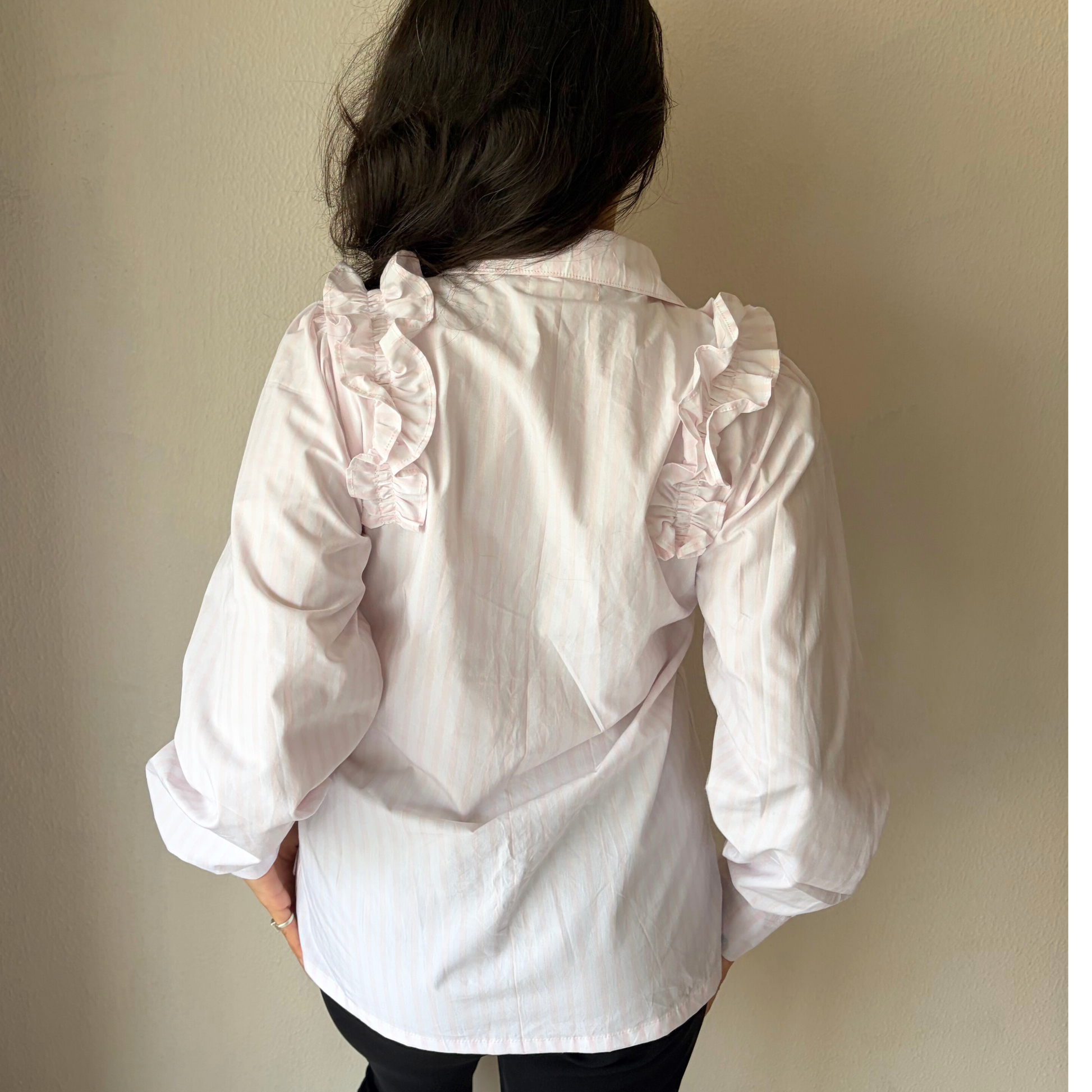 A pink and white striped shirt in a relaxed, slightly oversized fit for all-day comfort. Finished with stitched ruffle detailing along the front, it adds a soft, romantic touch to a classic silhouette. Perfect for everyday wear, from casual outings to office styling.