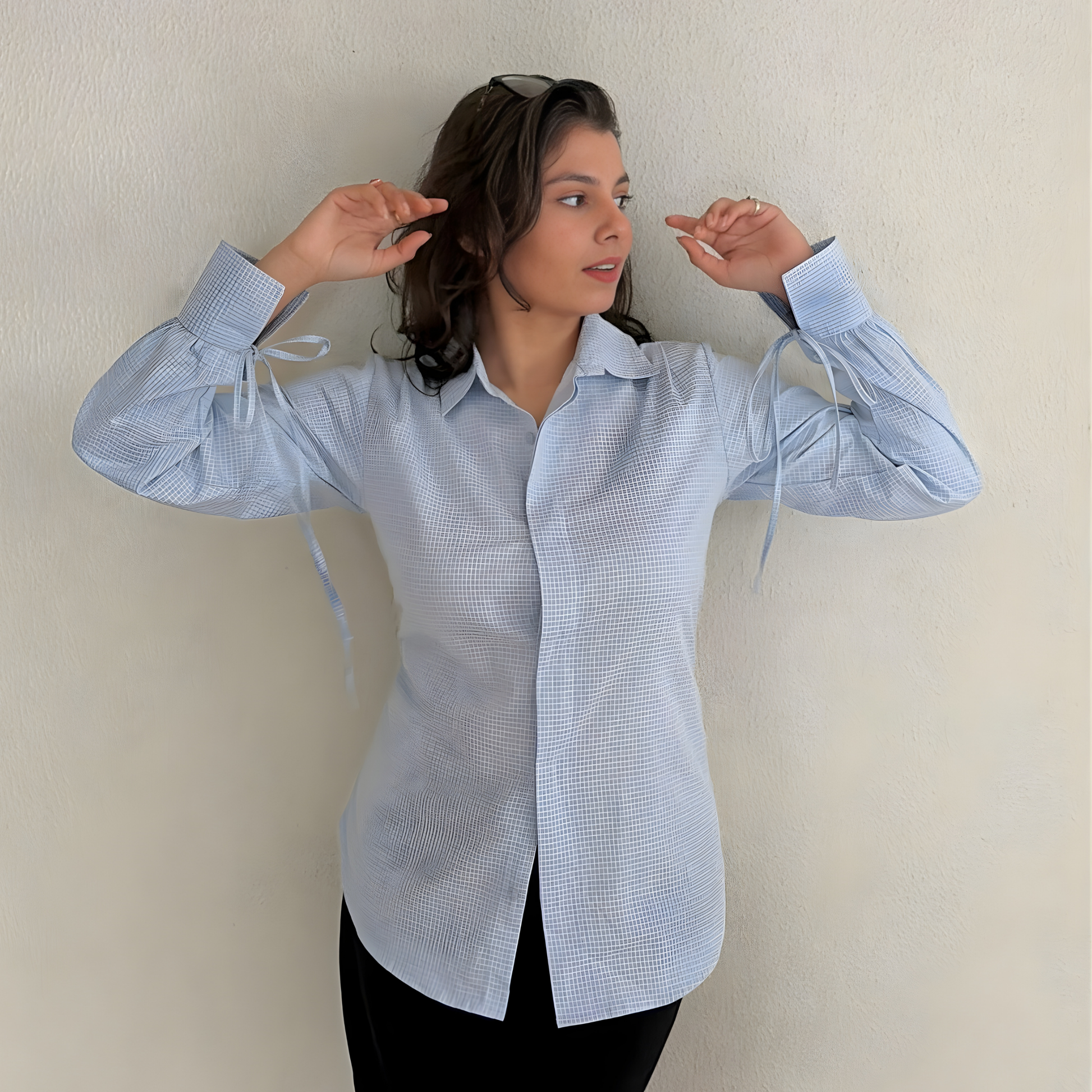 A blue poplin shirt with a subtle checkered print, designed for effortless everyday wear. Featuring cute tie-up details on the sleeves and a corset-style back for a flattering fit, this versatile piece is breathable, polished, and ideal for office or casual styling.