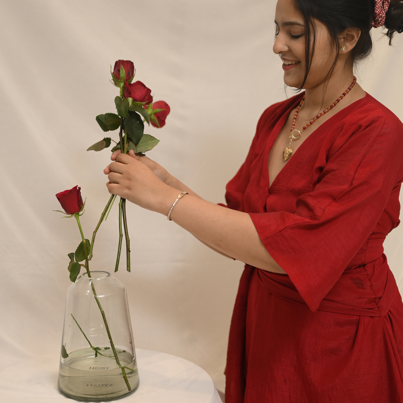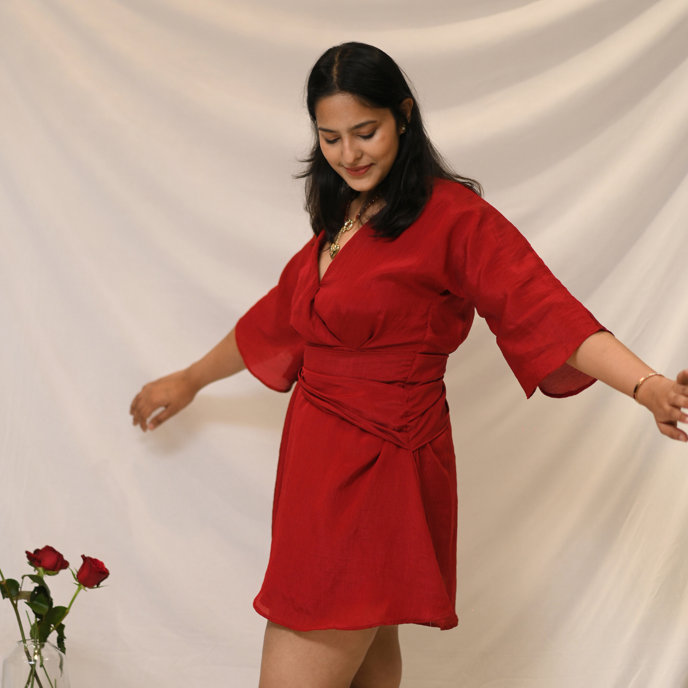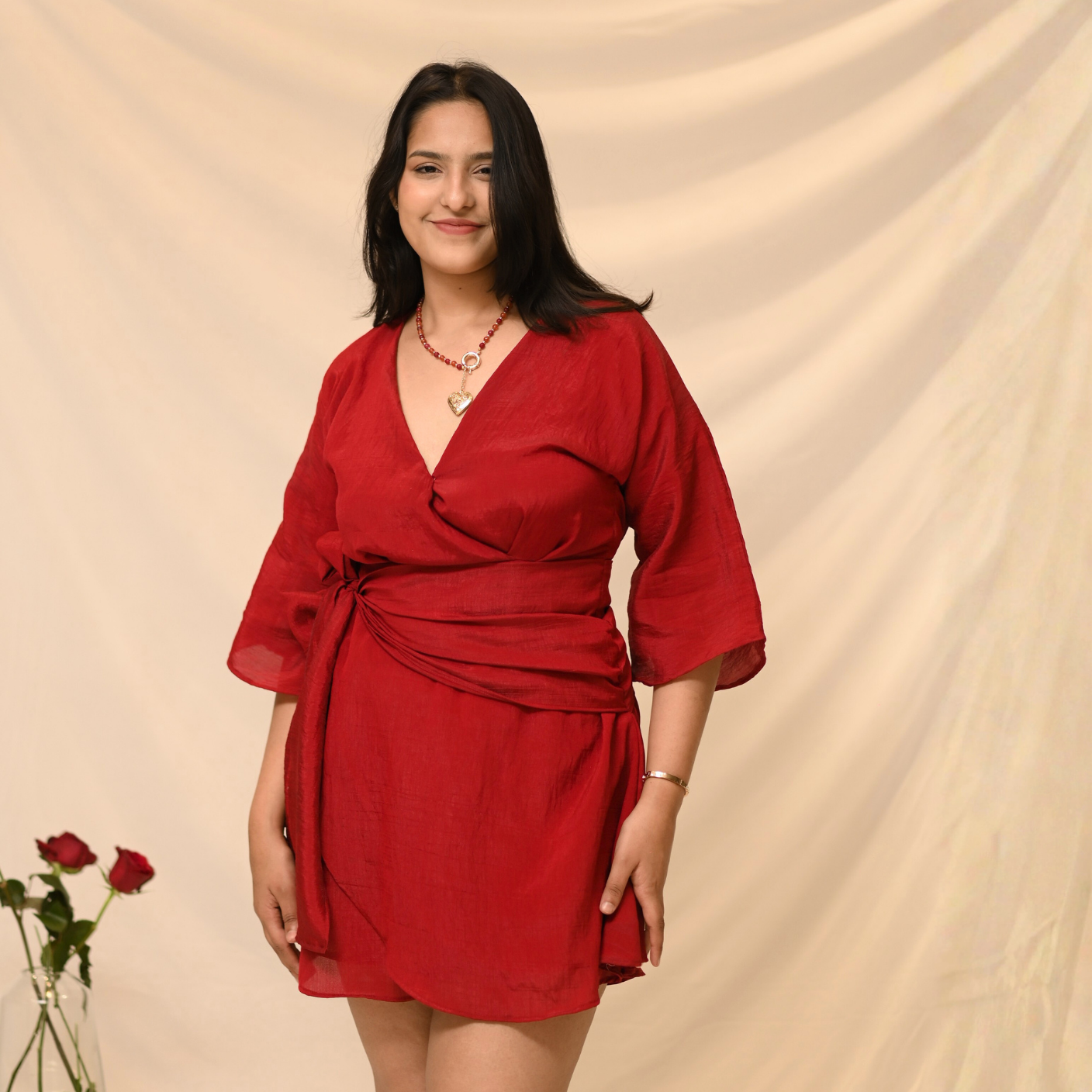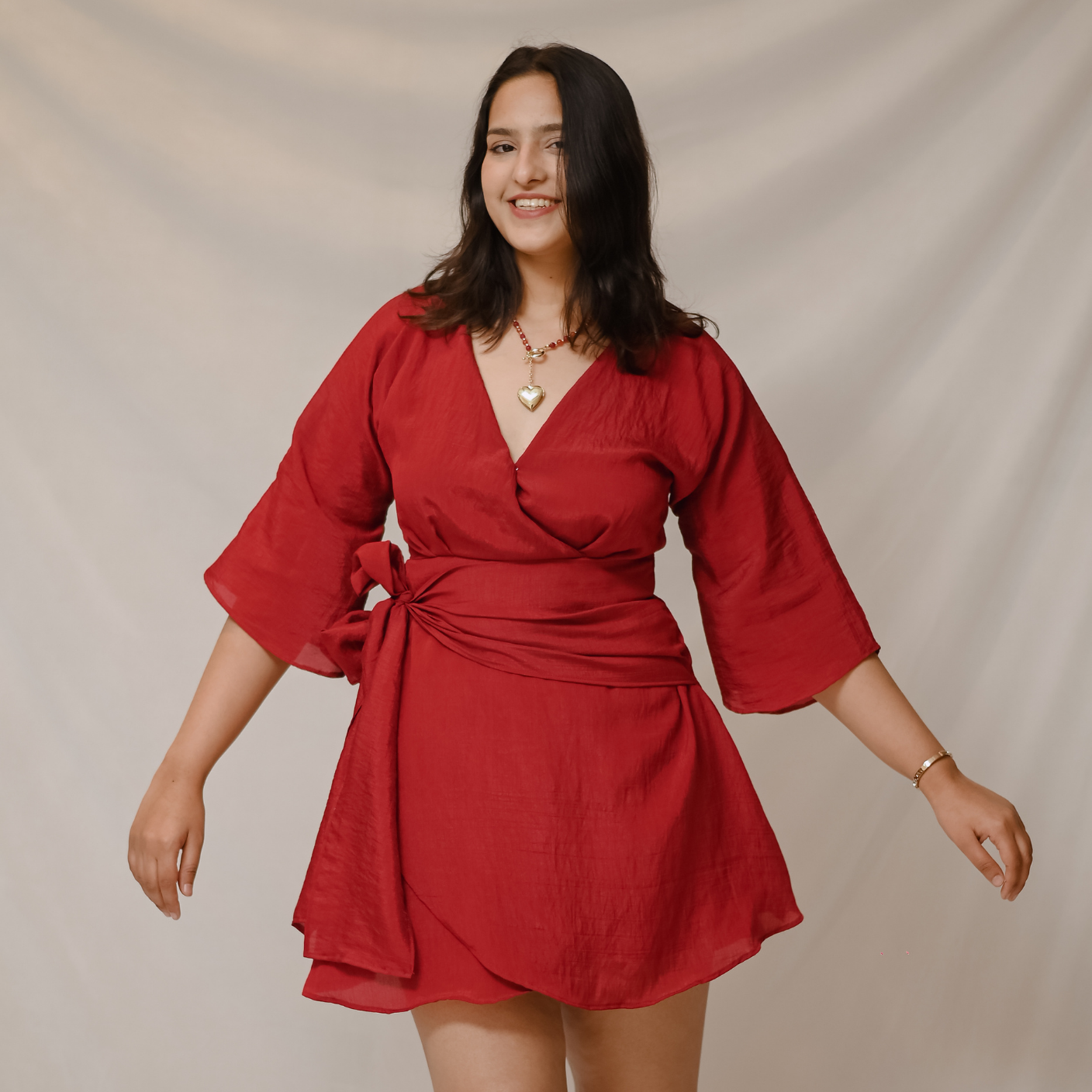 The Rosie Dress is a wrap silhouette with kimono-style sleeves, crafted in crushed tissue silk. Designed in a universally flattering red, it drapes beautifully and enhances every body shape with ease and comfort.