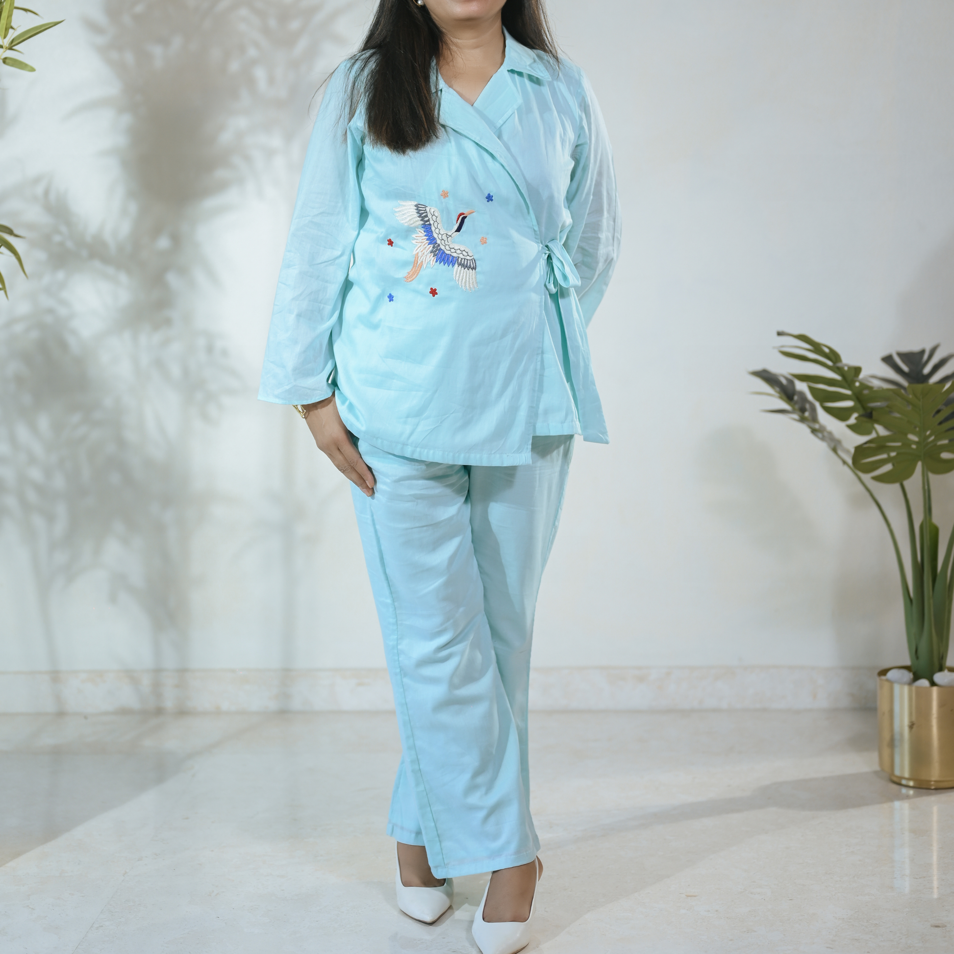 A pure mul co-ord set featuring a kimono-style wrap top with delicate hand embroidery of a bird motif. Soft, breathable, and gentle on sensitive skin—perfect for small festivities, intimate gatherings, or elegant daywear.